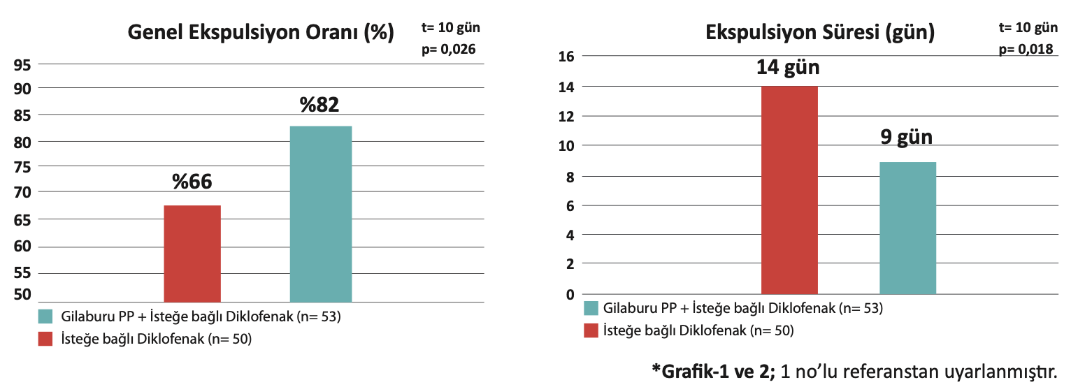 Bu klinik çalışmada; Gilaburu PP ve isteğe bağlı diklofenak ile tedavi edilen grubun, sadece diklofenak ile tedavi edilen gruba göre kıyaslandığında <10 mm distal üreter taşları için daha yüksek ekspulsiyon oranına ve daha kısa pasaj süresine sahip olduğu bulunmuştur (1).