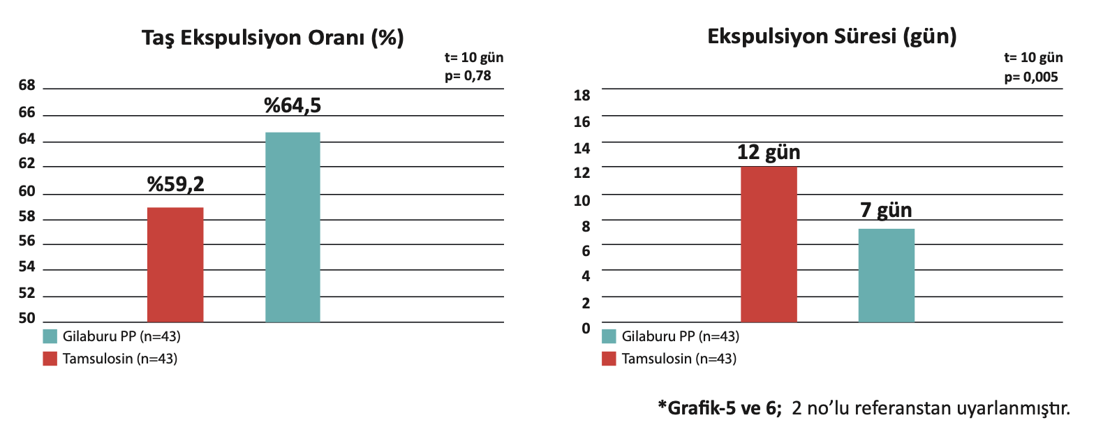 Bu klinik çalışmada; distal üreter taşlarının MET’inde en sık kullanılan ajan olan Tamsulosin ile Gilaburu PP karşılaştırıldığında taş ekspulsiyon oranı açısından Gilaburu PP’nin en az Tamsulosin kadar etkili olduğu ve bununla birlikte Gilaburu PP’nin daha kısa ekspulsiyon süresine sahip olduğu bulunmuştur (2).