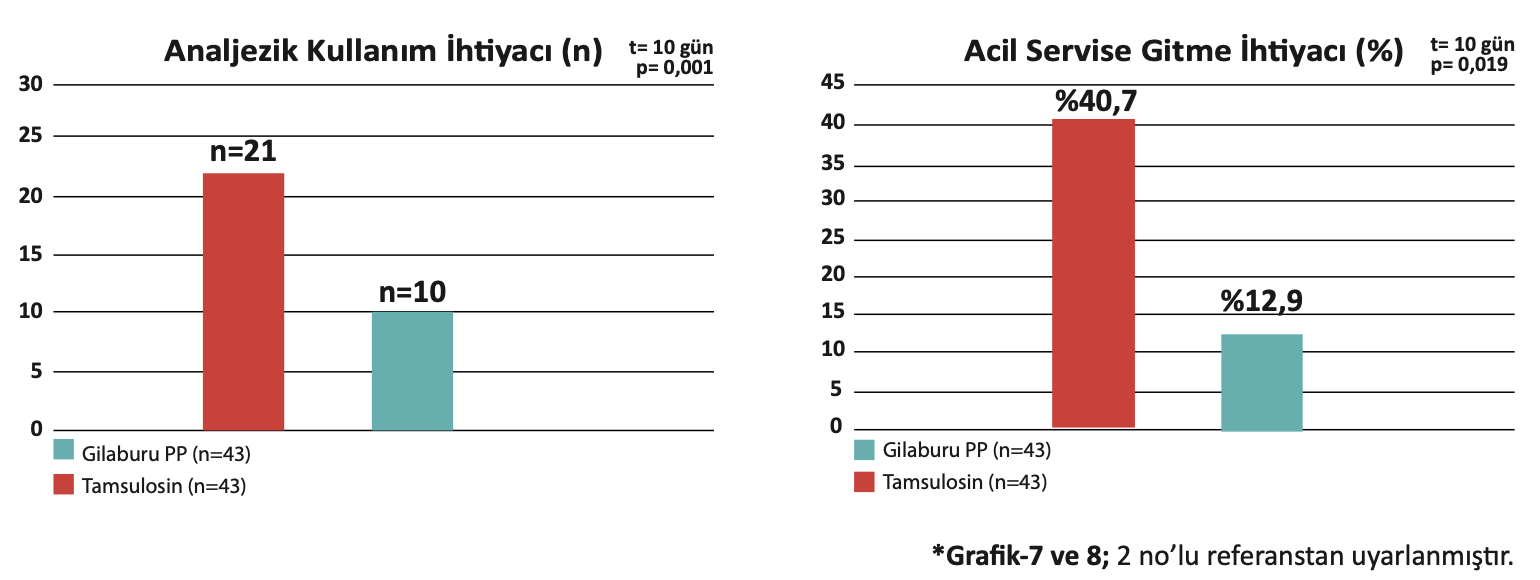 Bu klinik çalışmada Gilaburu PP grubunda; analjezik kullanımı ve acil servise gitme ihtiyacı Tamsulosin grubundan istatistiksel olarak daha düşük bulunmuştur, aynı zamanda Gilaburu PP grubunda ameliyat gereksiniminin önemli düzeyde azaldığı tespit edilmiştir (2).